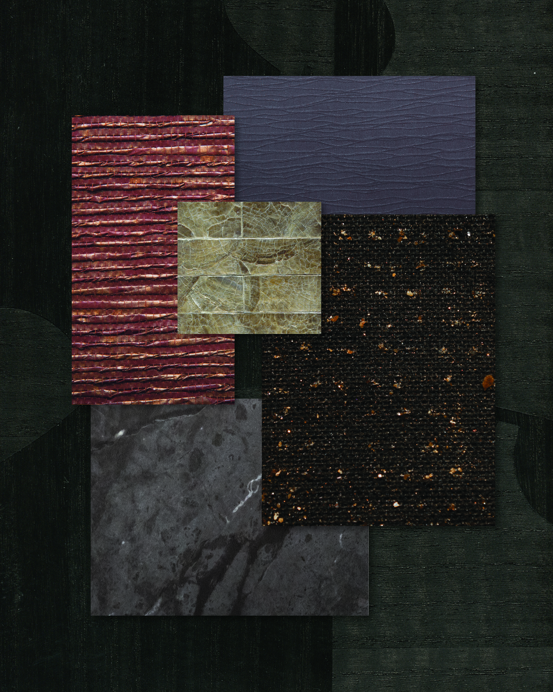 Shimmering Burlap™ in Mahogany Luxe glows with subtle bronze intrigue, and Natural Elements™ in Marquina Black Marble anchors the palette in dark, stone-inspired sophistication.