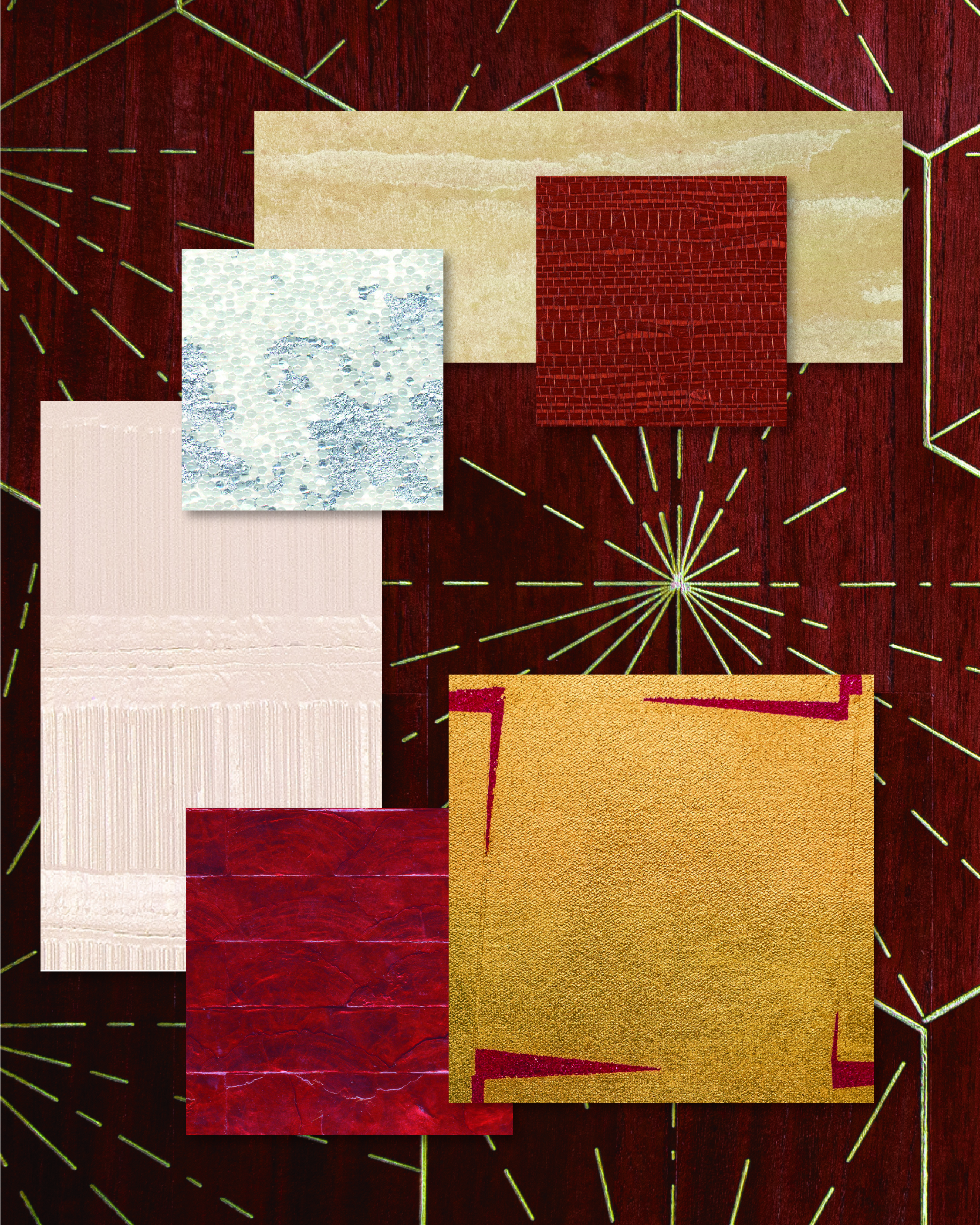 Ajiro™ Burst of Happiness in Wine O’clock sets a seductive tone with its deep, dimensional red and gold metallic hexagonal pattern that shimmers through natural wood like a spark beneath candlelight—an irresistible foundation for a Valentine’s Day mood.