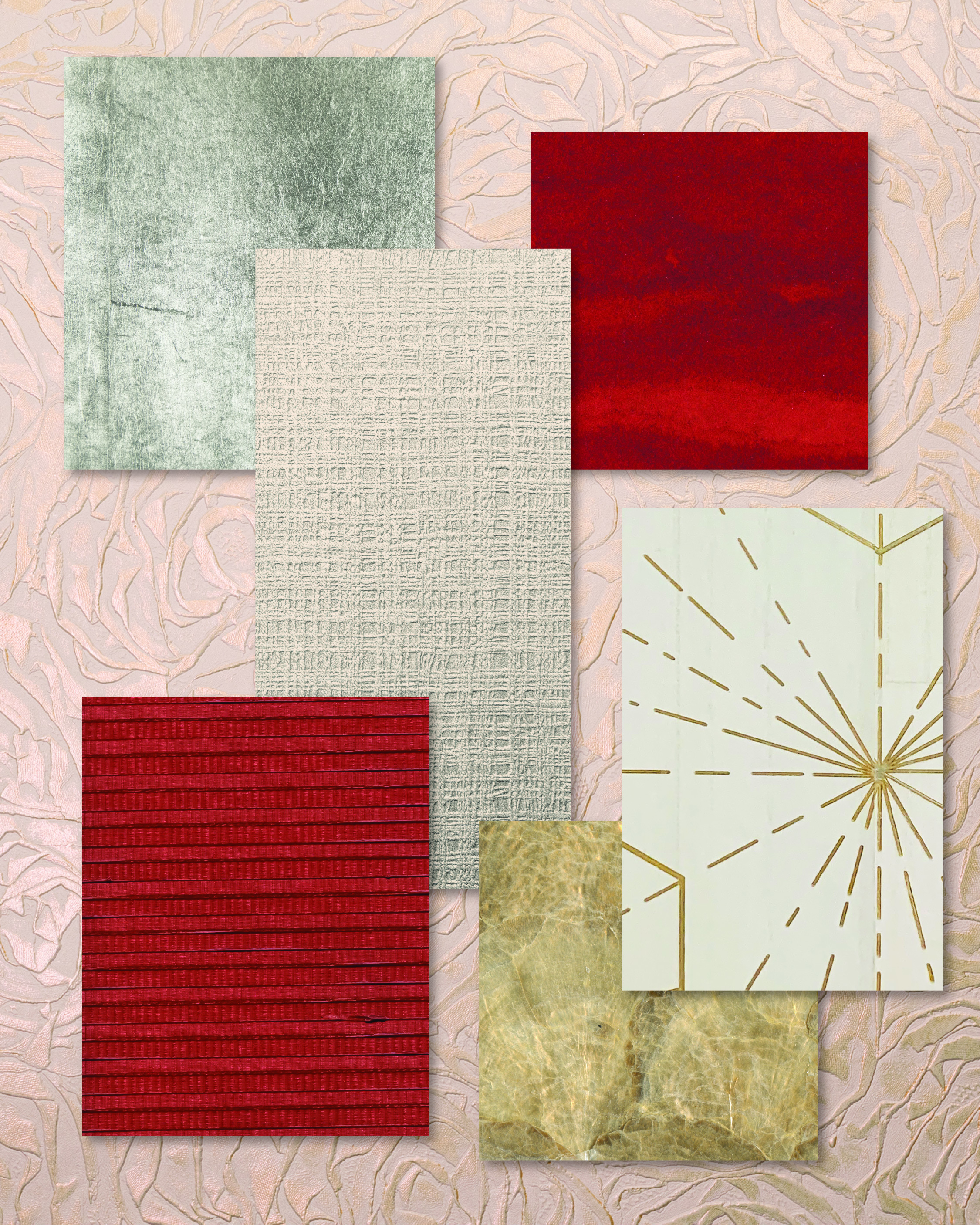 Beadazzled Leaf™ in Sylvie Leaf and Gilded Cloth™ in Golden Vermillion introduce luminous silver and gold, capturing a playful passion. Conduit™ in Rosy Rebar, a tender blush brushed over rhythmic texture, ties the composition together in one romantic, unforgettable embrace.
