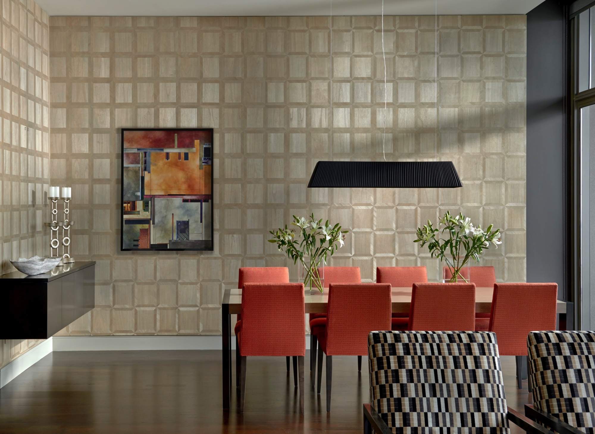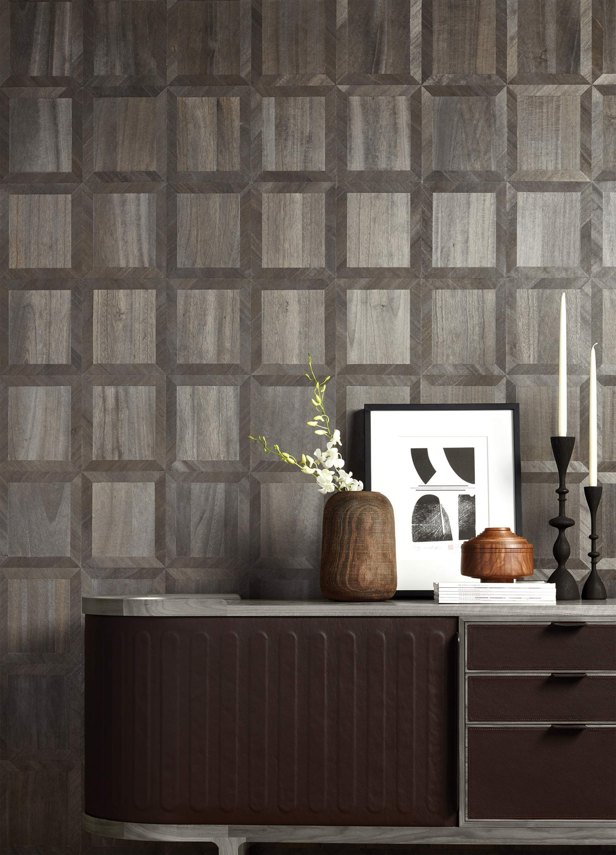 Ajiro Coffers is hand‑inlaid wood veneer in a parquet frame, creating a classic effect. Micro‑thin wood on paper backing, Ajiro is flexible enough to wrap columns and even turn corners. A cost-effective and sustainable alternative to traditional wood paneling. Finished in our Chicago studio.