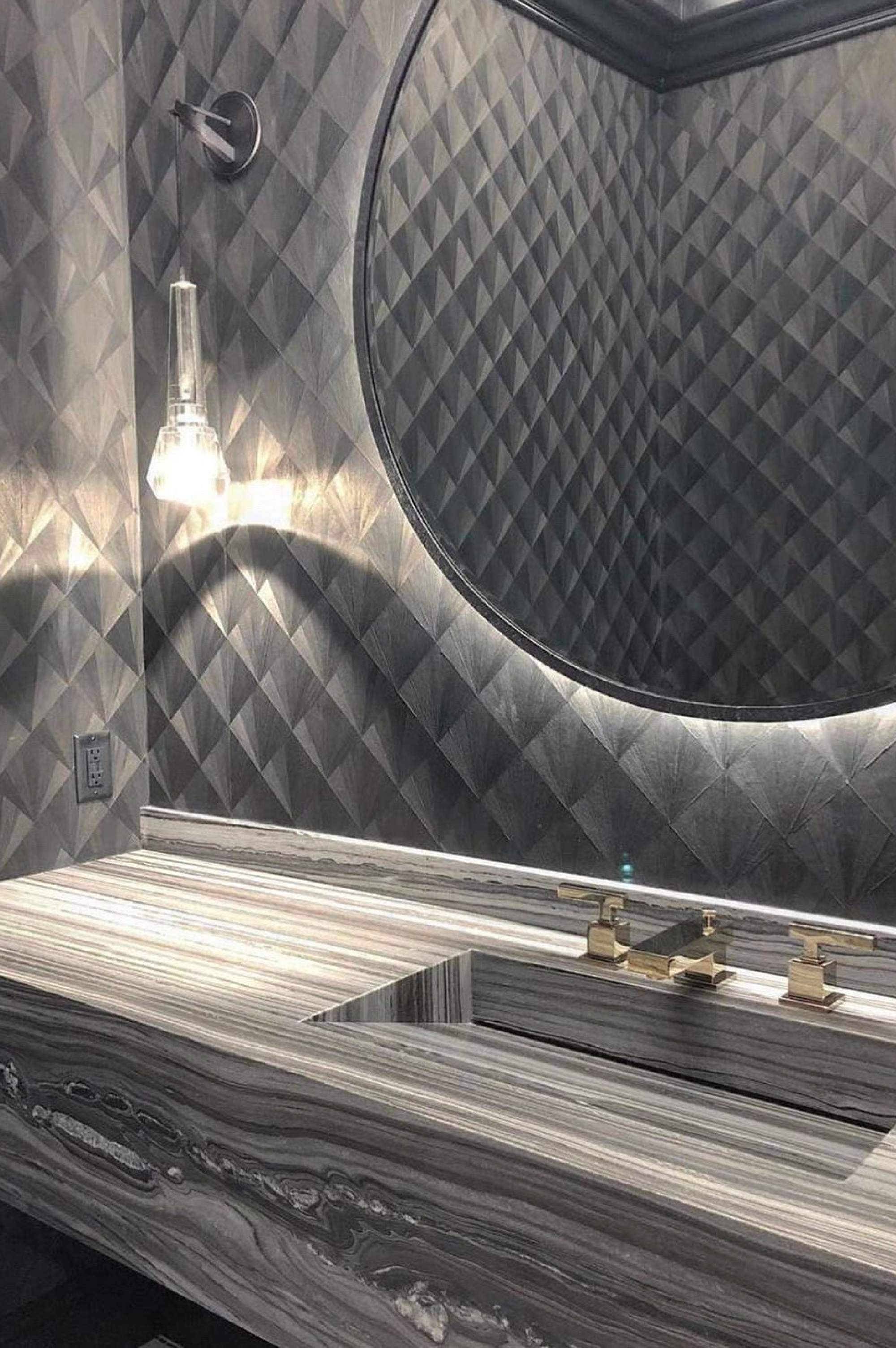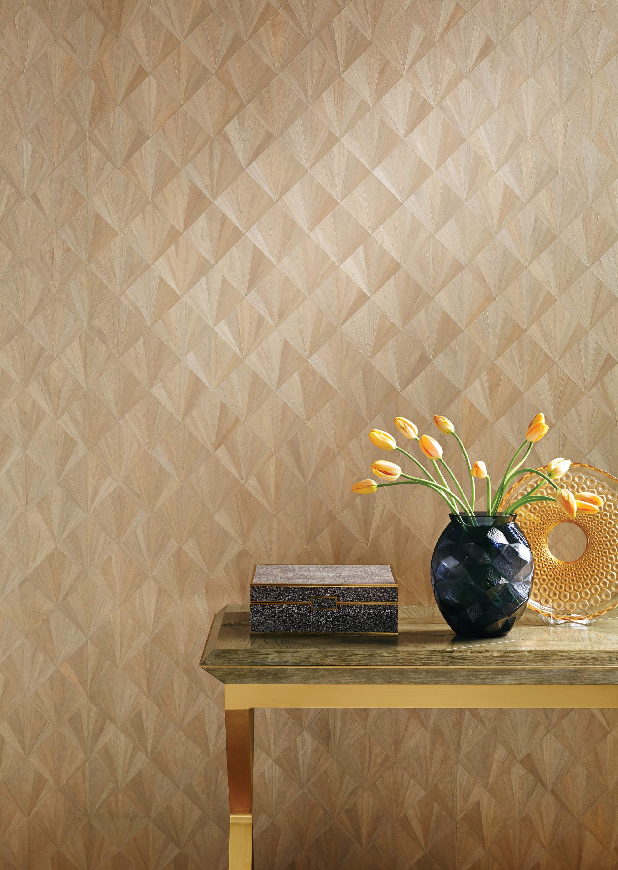 Intricately hand-inlaid micro-thin wood veneer references Art Deco straw veneer. Fanfare is flexible enough to wrap columns and turn corners. A cost-effective and sustainable alternative to traditional wood paneling. Finished in our Chicago studio.